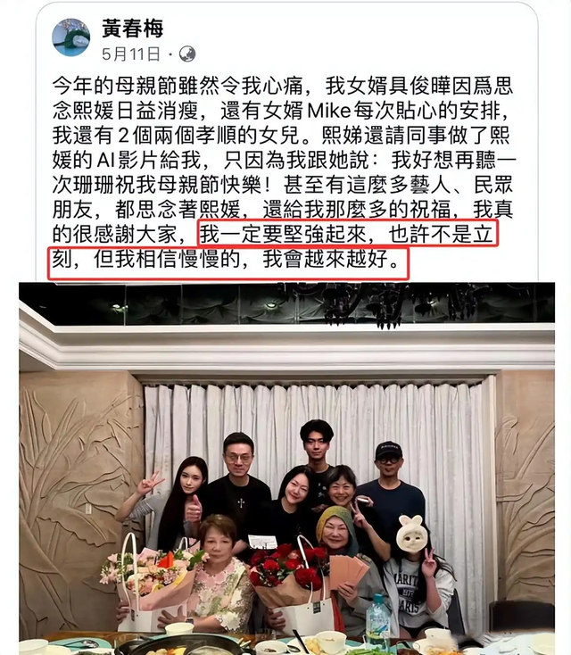 这段话其实是她今年母亲节时发布的,如今再次提及,似乎暗示她的情绪仍未完全走出低谷。母亲节当天,S妈罕见晒出了一张没有大S的全家福,并表达了想要振作的愿望,但显然,她的心情依然复杂。