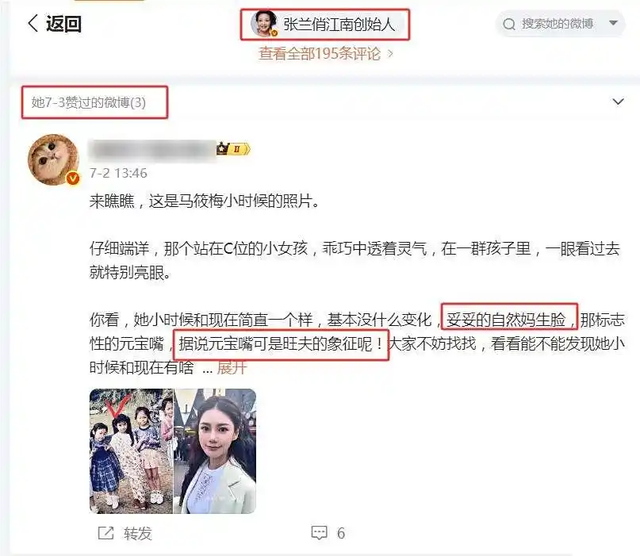 尽管张兰争议不断,但她对儿媳马筱梅的疼爱却是实打实的。7月3日,张兰点赞了一条力挺马筱梅的博文,该博主晒出马筱梅儿时的照片,称赞她是“妈生脸”“旺夫相”,张兰的举动无疑是对儿媳的公开支持。